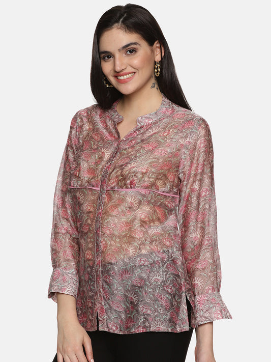 GREY PINK FLORAL BLOCK PRINT FORMAL SHIRT IN CHANDERI