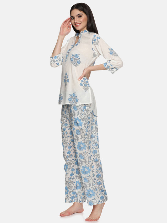WHITE AND BLUE BLOCK PRINT LOUNGE WEAR