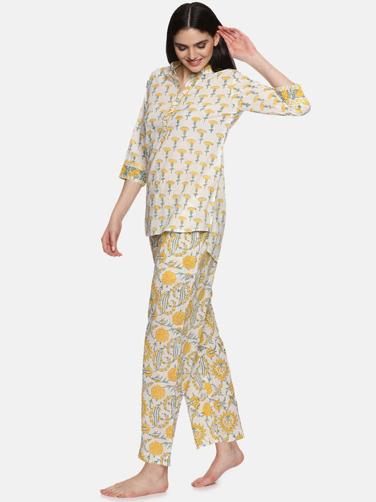 WHITE AND YELLOW BLOCK PRINT LOUNGE WEAR
