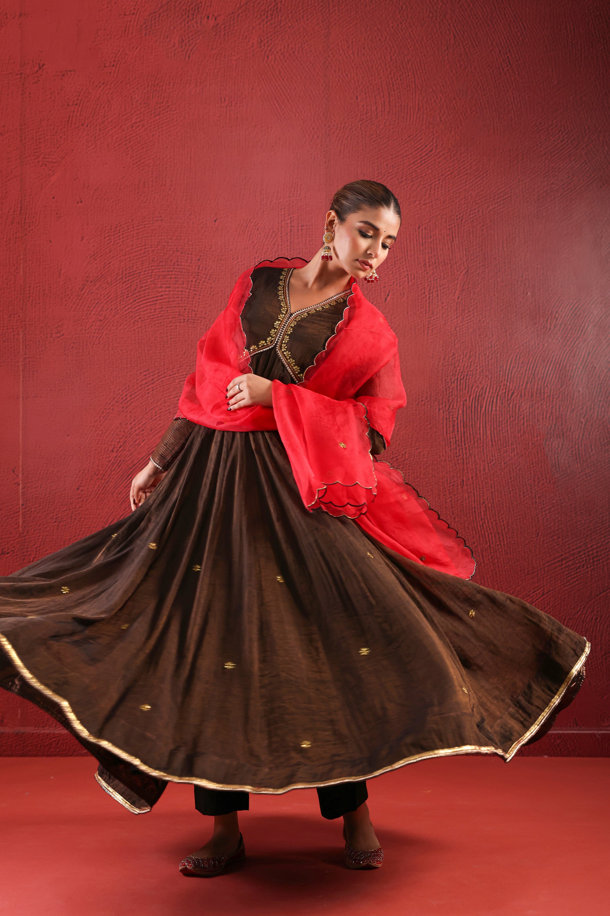 A Black Brownish Zari Anarkali is an elegant and sophisticated outfit that combines a deep, rich color palette with intricate zari embroidery. This combination makes it perfect for formal events like weddings, receptions, and festive occasions.