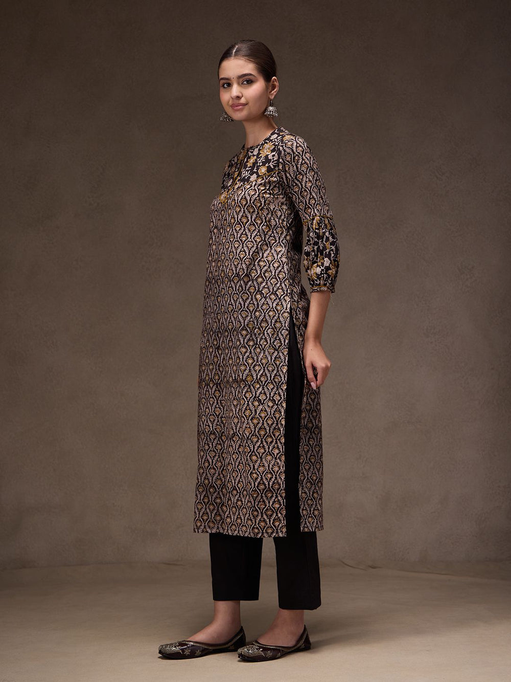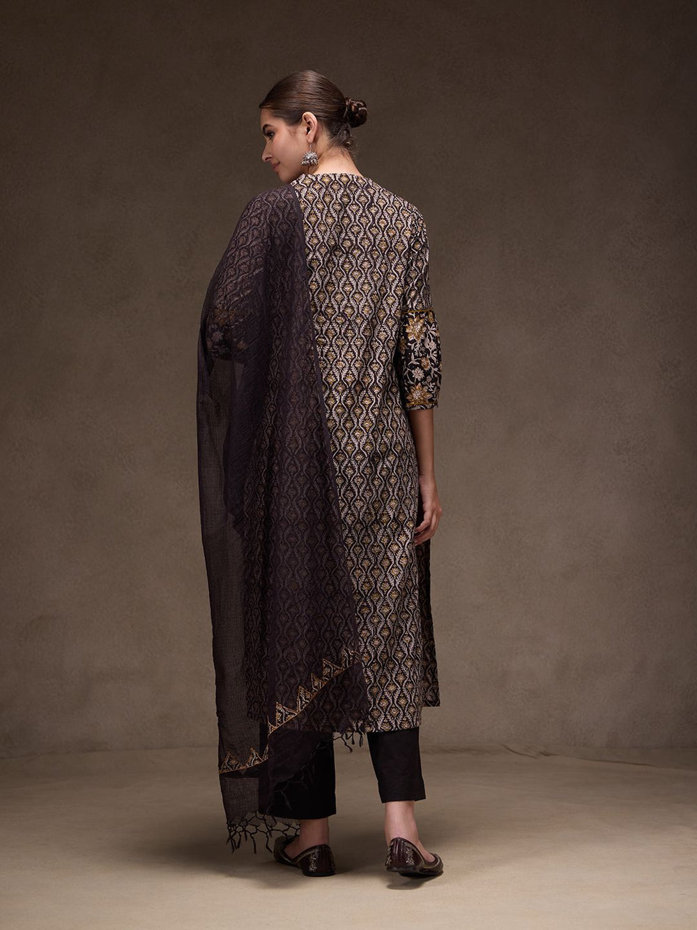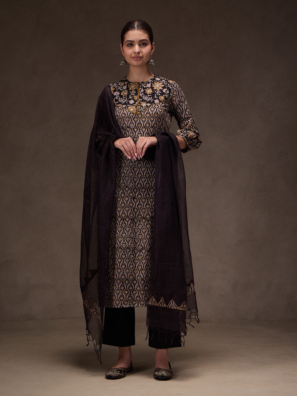 Elevate your summer wardrobe with Jaipuri Banno’s timeless black suit, exquisitely crafted in pure, breathable cotton. Paired with a delicate Kota Doria dupatta, celebrated for its feather-light texture and refined weave, this ensemble exudes understated luxury. Designed for effortless elegance, it offers a perfect balance of comfort and sophistication—ideal for sunlit days and graceful evenings.