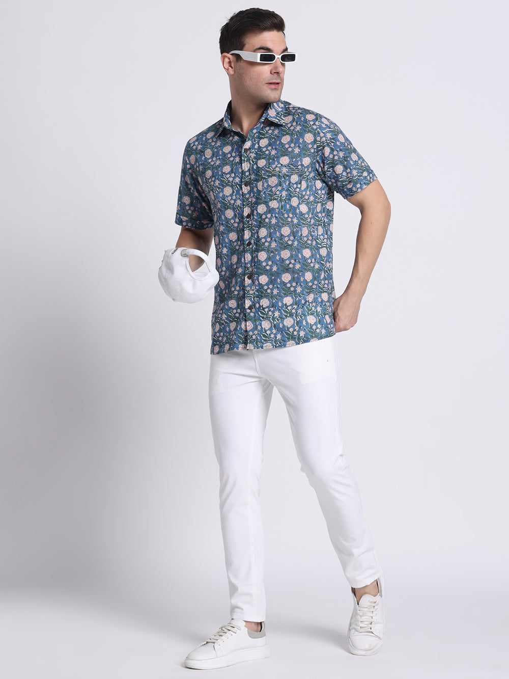 A stylish blue block-printed men's shirt, featuring bold, intricate patterns that add a unique touch to a classic design. Made from soft, breathable fabric, this shirt offers comfort and a relaxed fit, perfect for casual outings or semi-formal occasions. Its versatile style pairs easily with jeans or chinos for a modern, laid-back look.