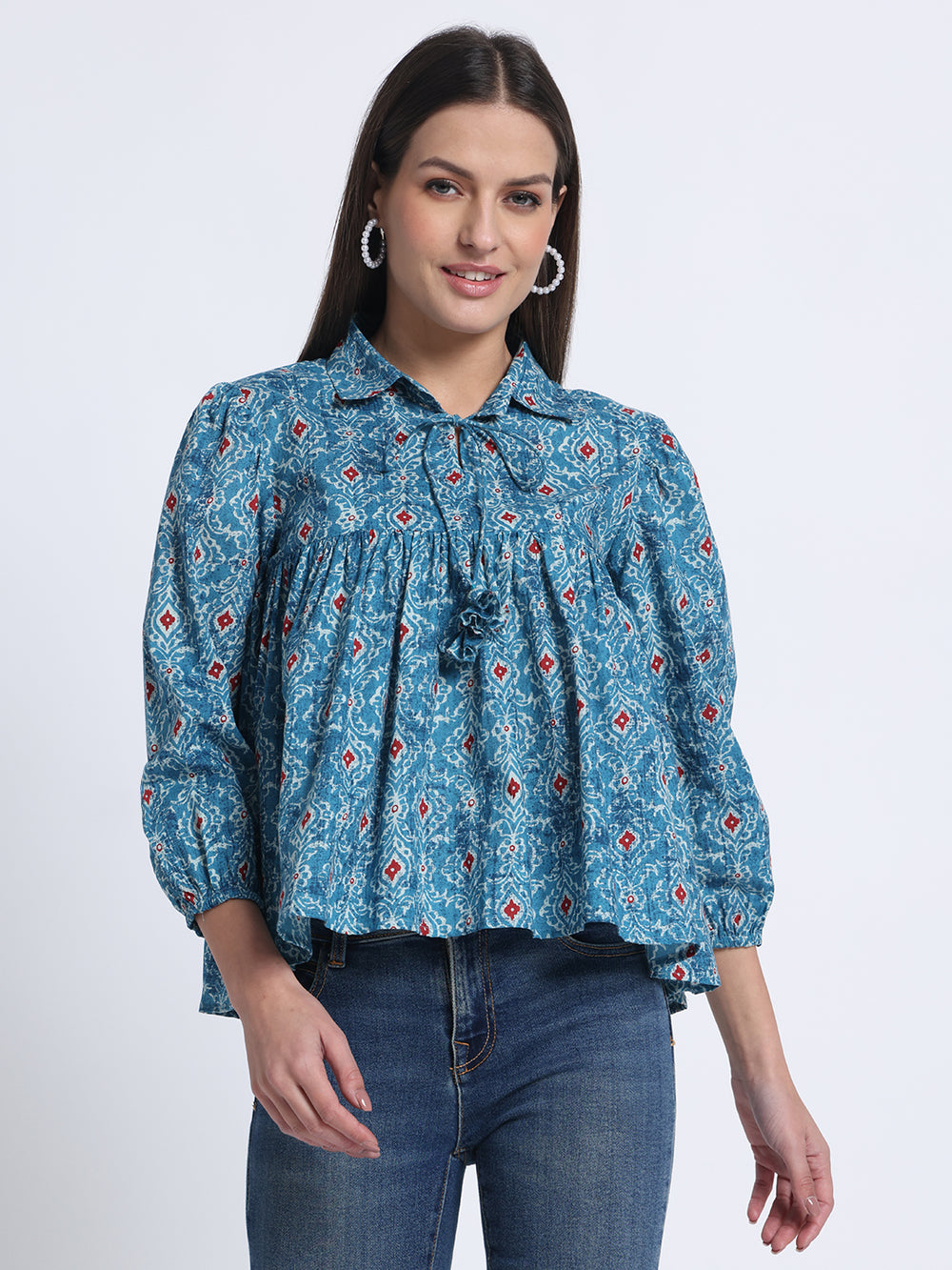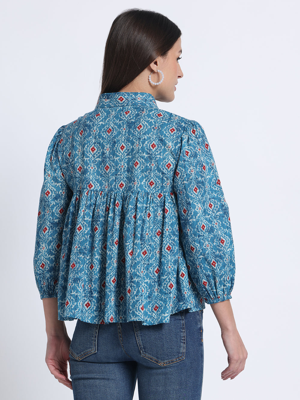 A stylish blue printed short kurta top, featuring intricate patterns in a bold, contrasting design. Made from soft, breathable fabric, this top offers a comfortable and relaxed fit. Perfect for casual outings or everyday wear, it combines traditional style with a modern twist, pairing effortlessly with jeans.