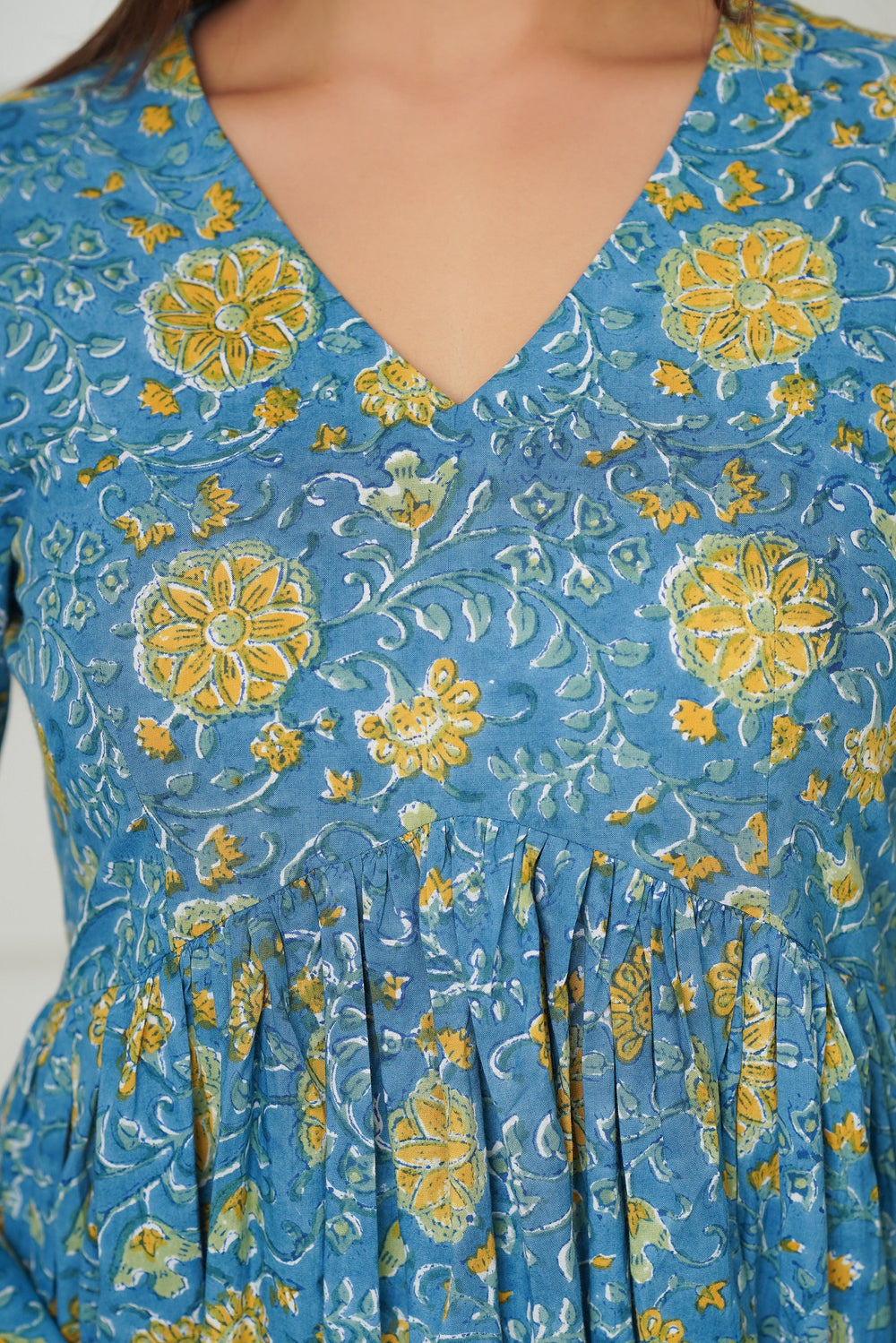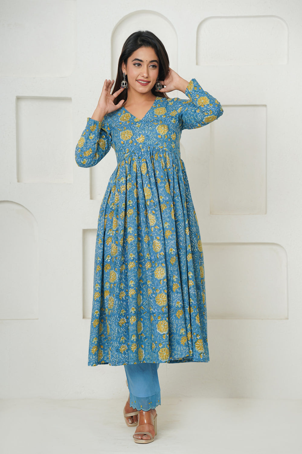 Introducing our stunning Blue Floral Handblock Print Flared Kurta, a harmonious blend of traditional artistry and modern flair. Adorned with intricate cutwork embroidery on a Kota Doriya Dupatta, this ensemble exudes elegance and sophistication. Paired with comfortable cotton pants, it offers both style and ease. Each floral motif, meticulously handcrafted, tells a story of heritage and craftsmanship. Perfect for festive occasions or casual gatherings, this ensemble promises to turn heads and leave a lasting impression. Embrace the timeless beauty of handblock printing with this exquisite piece.
