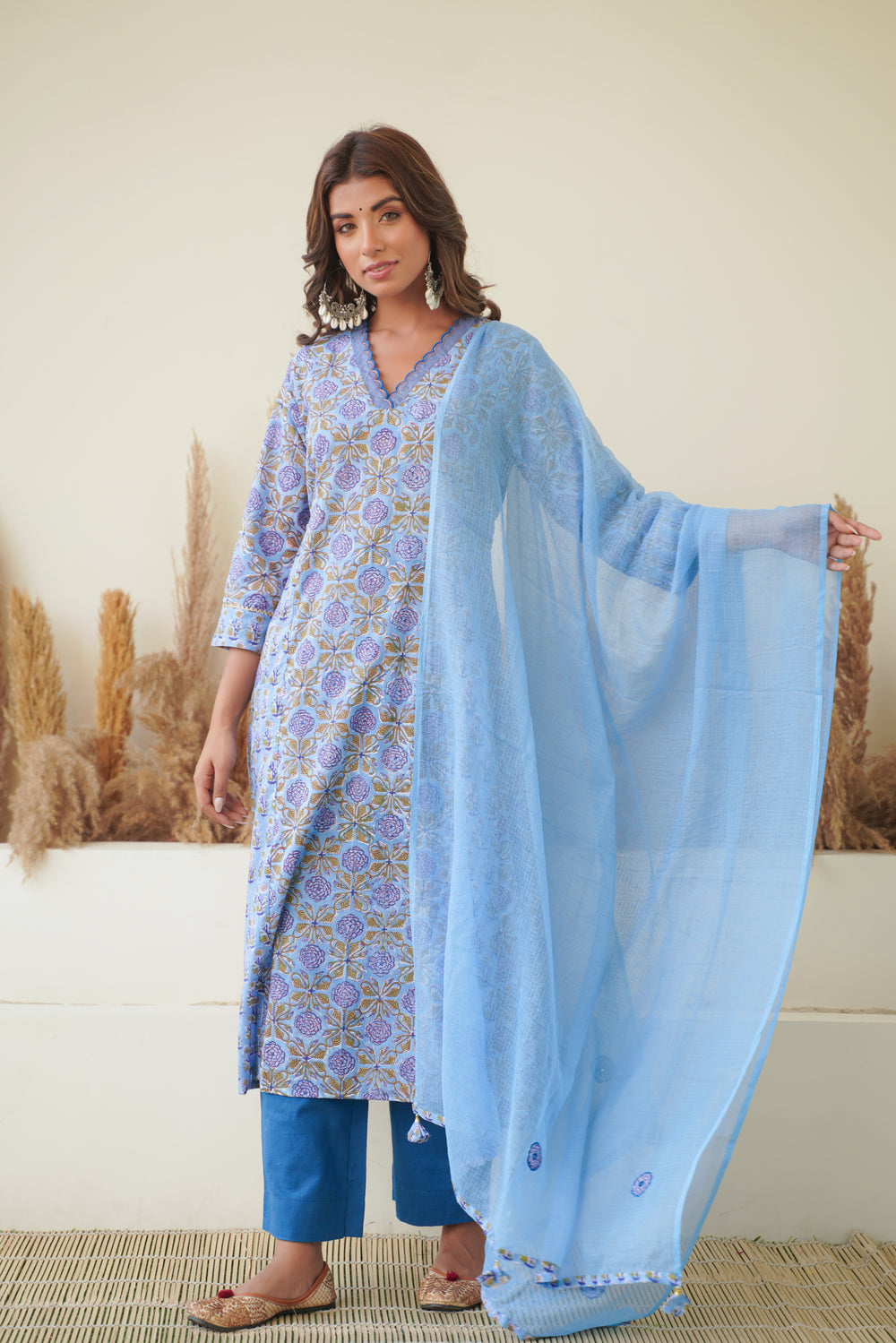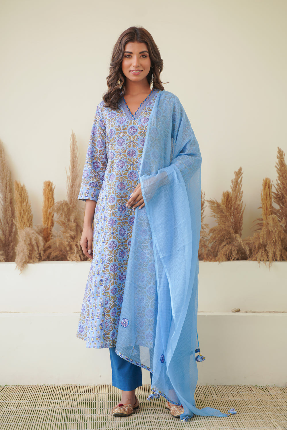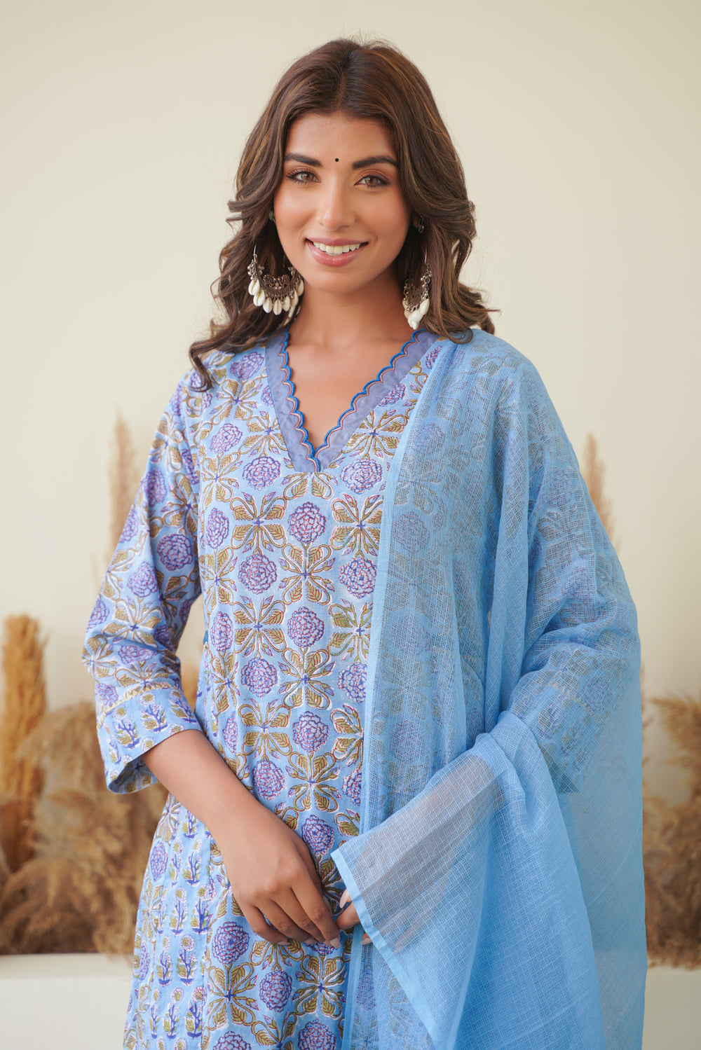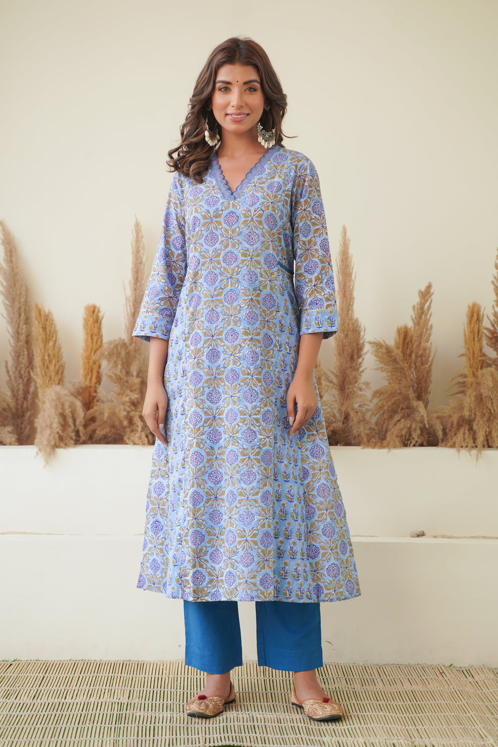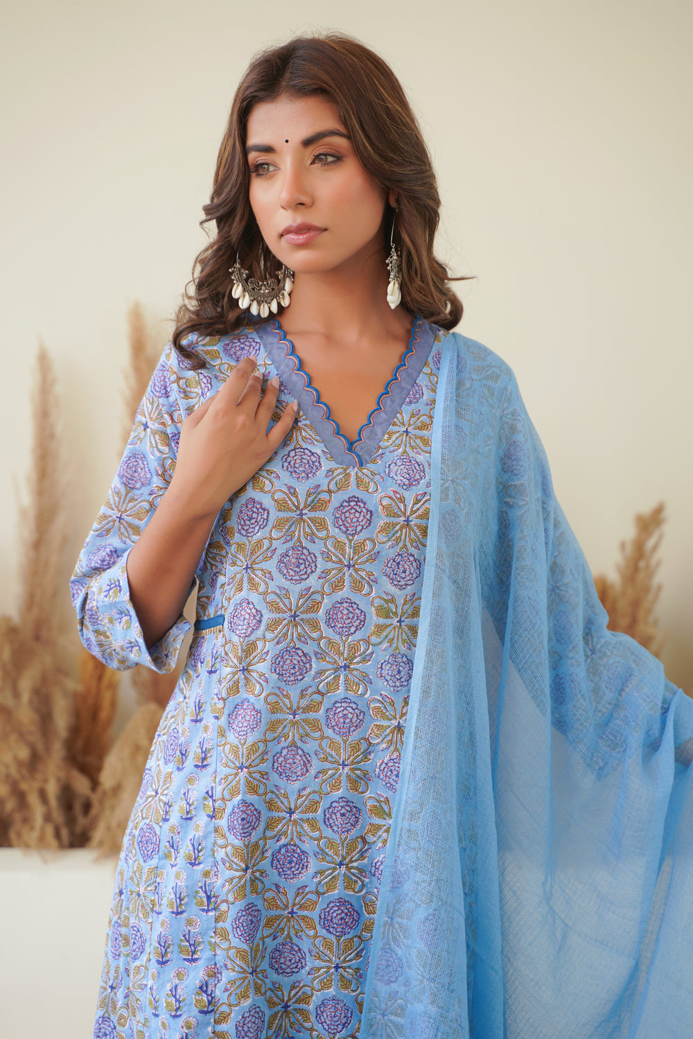 Introducing our enchanting Blue Floral Block Print Princess Cut Kurta, adorned with delicate cut work lace. Crafted from 100% cotton, this kurta promises comfort and style in equal measure. The intricate floral motifs and princess cut silhouette exude grace and sophistication, perfect for any occasion. Paired with straight pants crafted from the same premium cotton fabric and complemented by a Kota Doriya Dupatta, this ensemble is a celebration of timeless elegance and craftsmanship. Elevate your wardrobe with this exquisite piece and make a statement wherever you go.