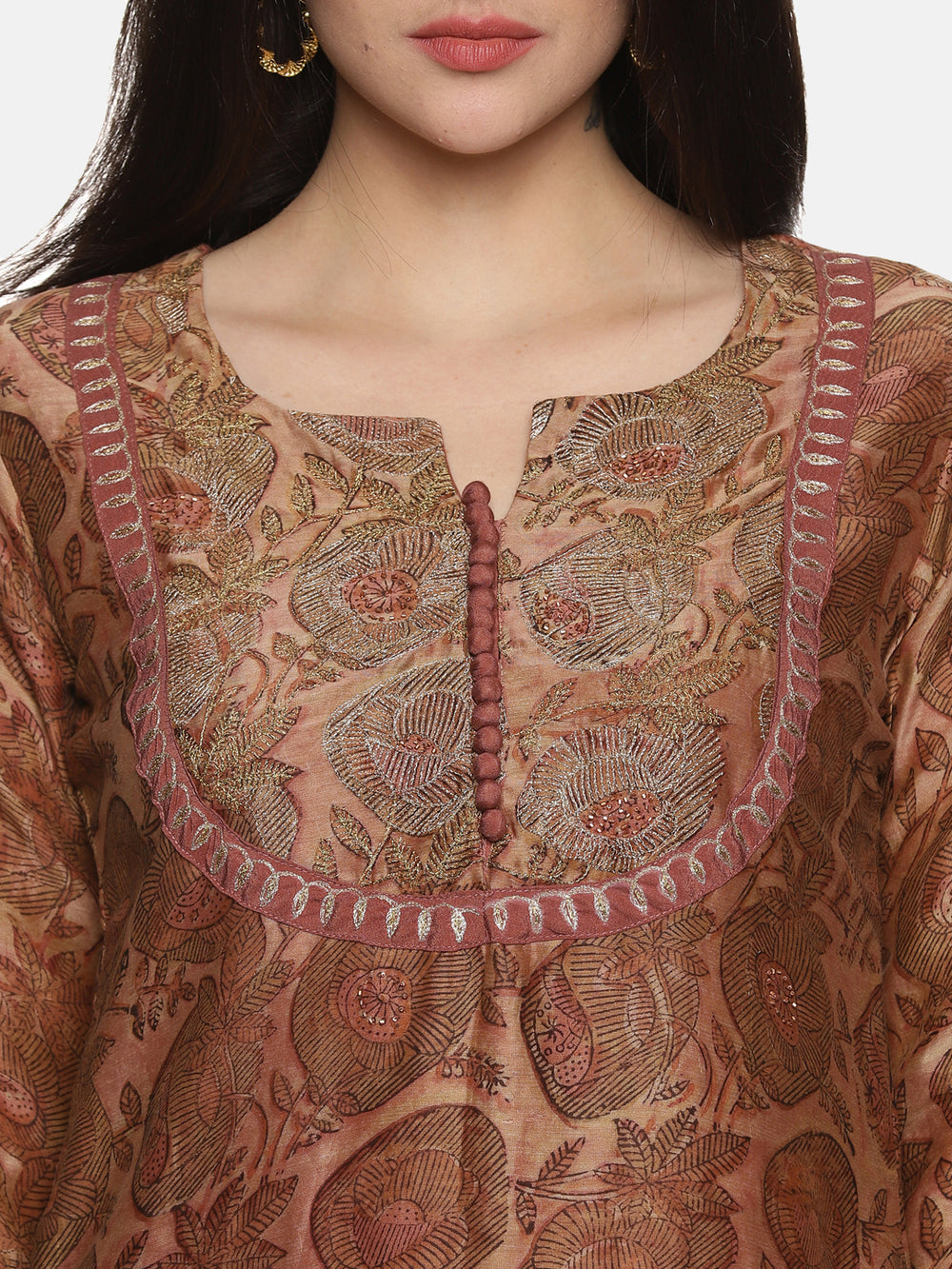 BROWN FLORAL BLOCK PRINT CHANDERI STRAIGHT KURTA SET EMBELISHED WITH ZARI EMBROIDERY