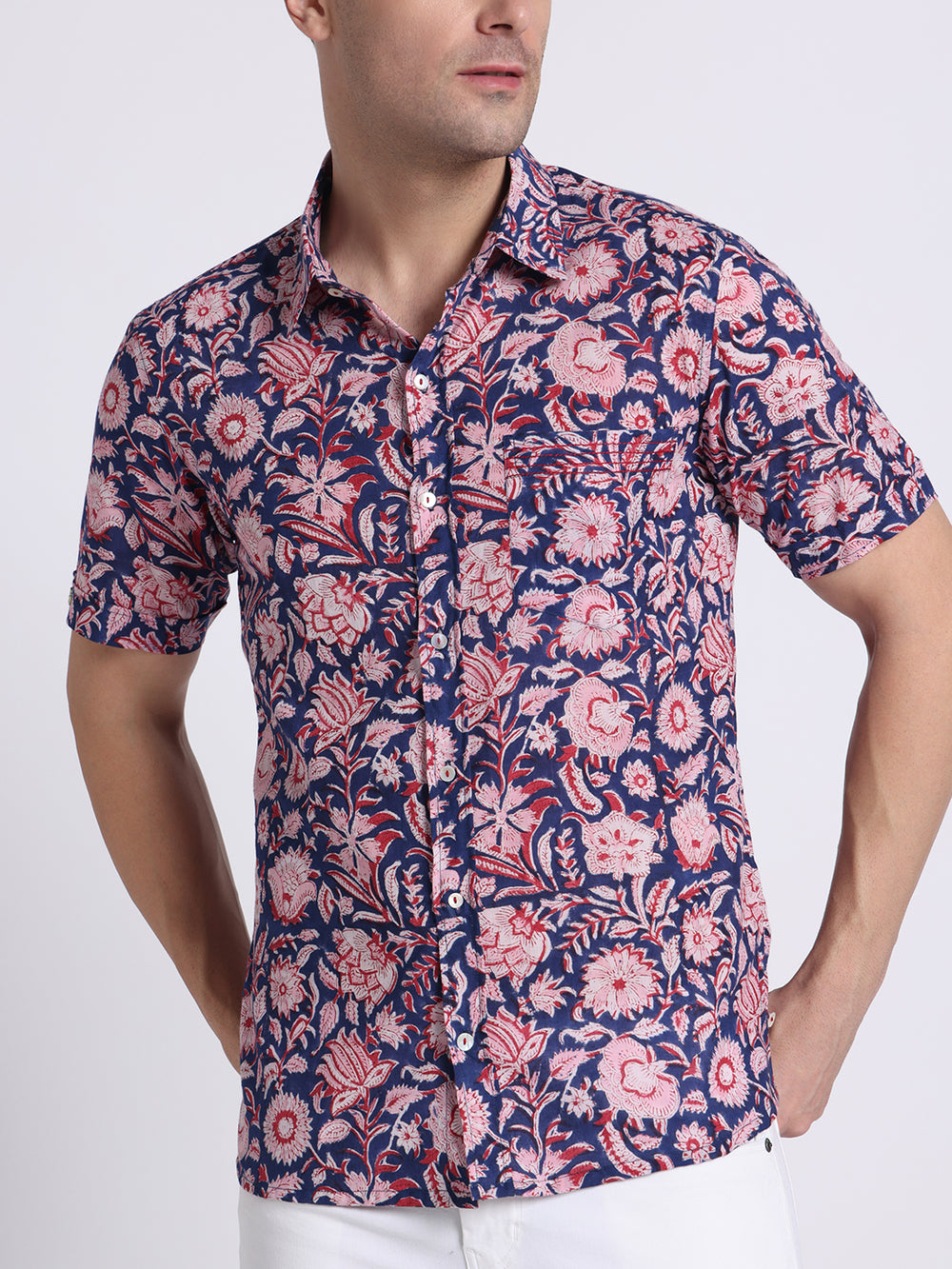 A dark blue block print men's shirt features intricate, handcrafted patterns created using traditional block printing techniques. The rich blue color serves as a bold backdrop for the unique designs, often showcasing floral, geometric, or abstract motifs. Ideal for casual or semi-formal occasions, this shirt combines a stylish, modern look with a touch of artisanal charm. Its lightweight fabric ensures comfort, while the block print adds a distinctive, cultural flair to the overall design.