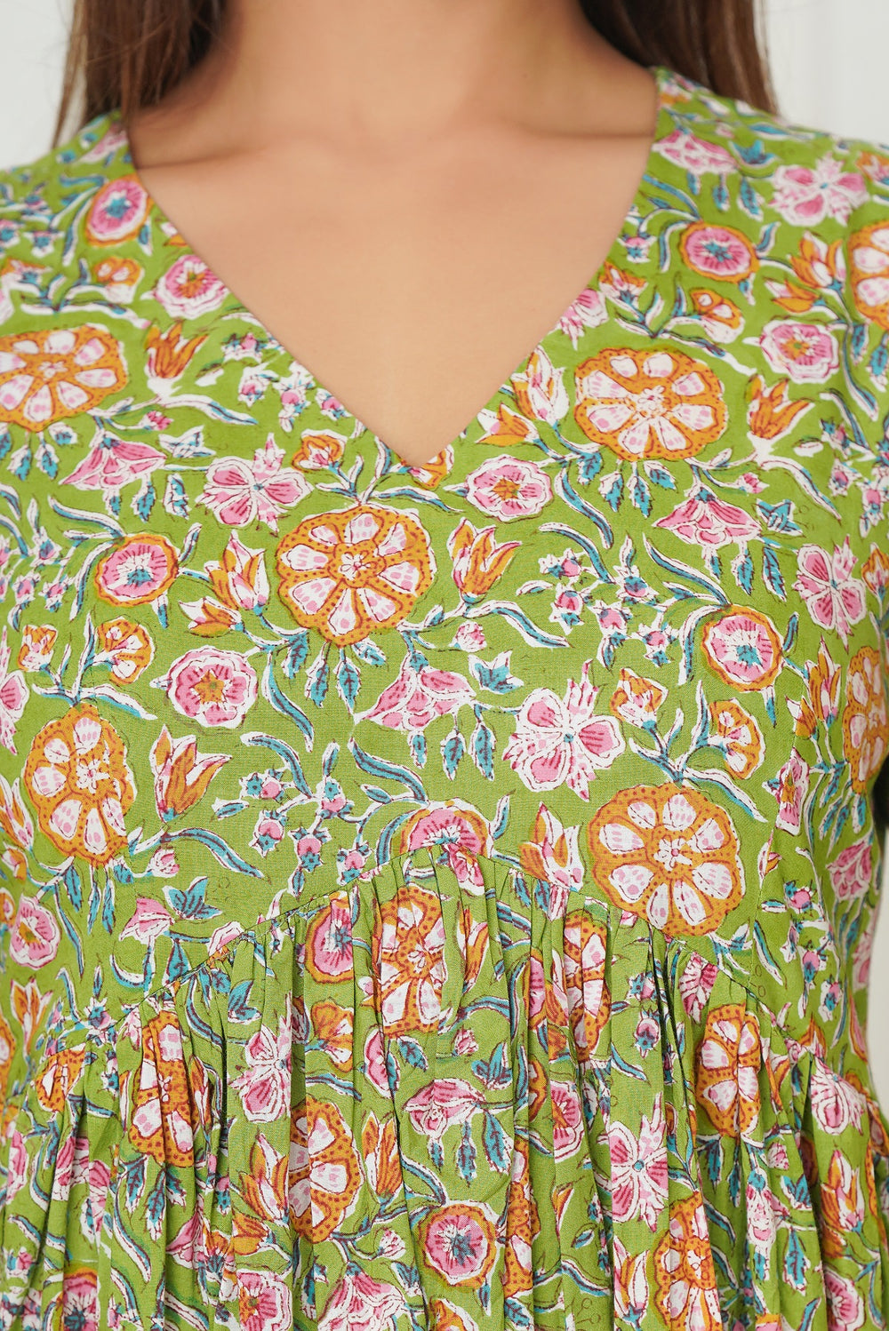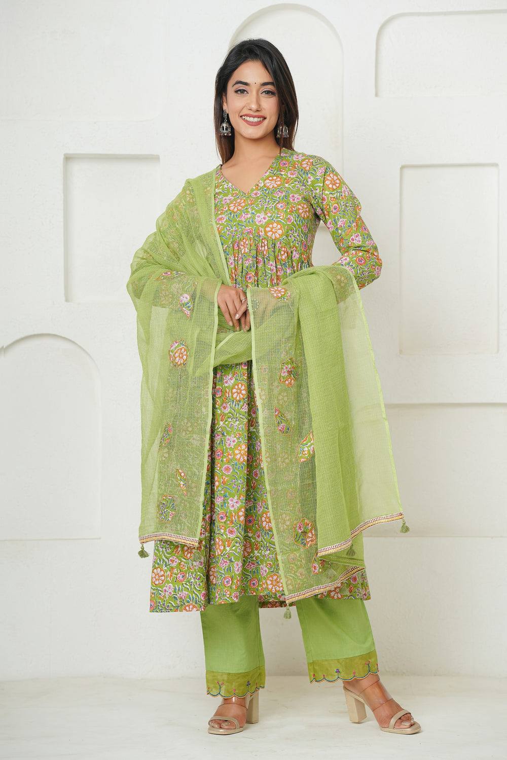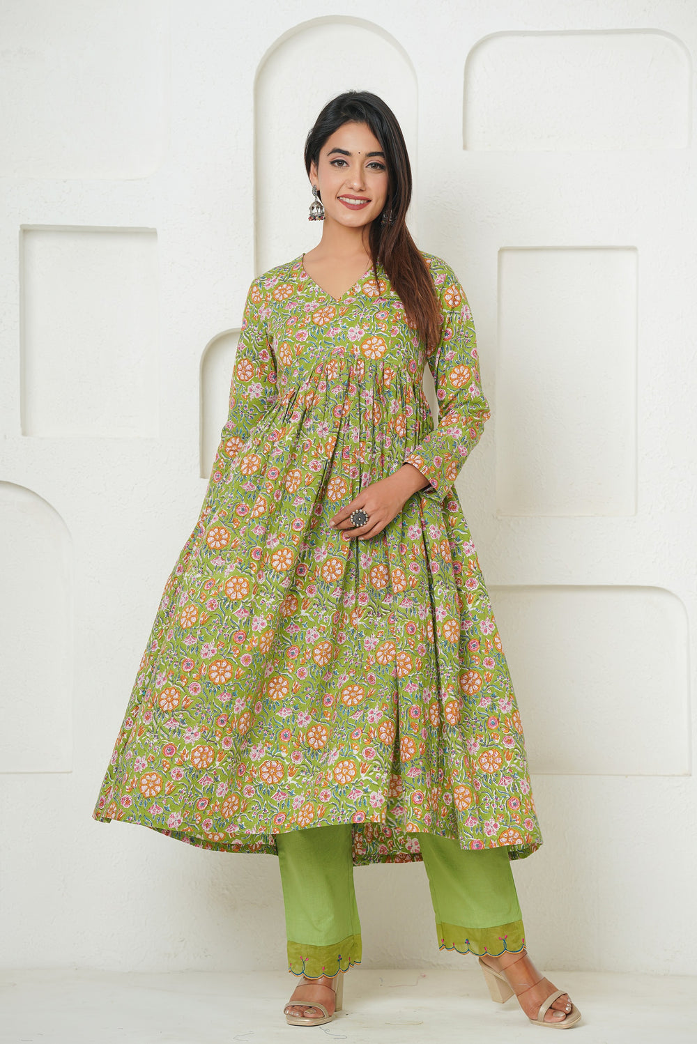 Introducing our stunning GREEN Floral Handblock Print Flared Kurta, a harmonious blend of traditional artistry and modern flair. Adorned with intricate cutwork embroidery on a Kota Doriya Dupatta, this ensemble exudes elegance and sophistication. Paired with comfortable cotton pants, it offers both style and ease. Each floral motif, meticulously handcrafted, tells a story of heritage and craftsmanship. Perfect for festive occasions or casual gatherings, this ensemble promises to turn heads and leave a lasting impression. Embrace the timeless beauty of handblock printing with this exquisite piece.