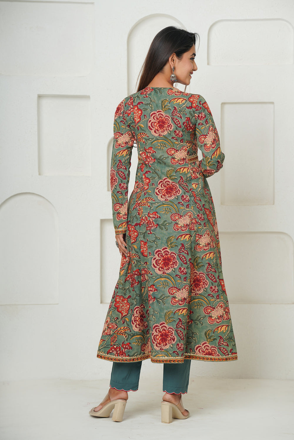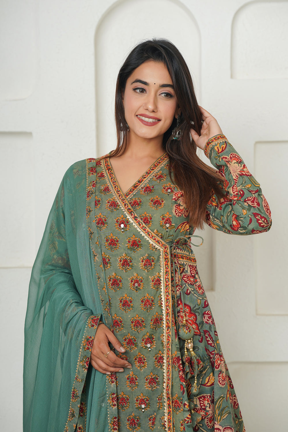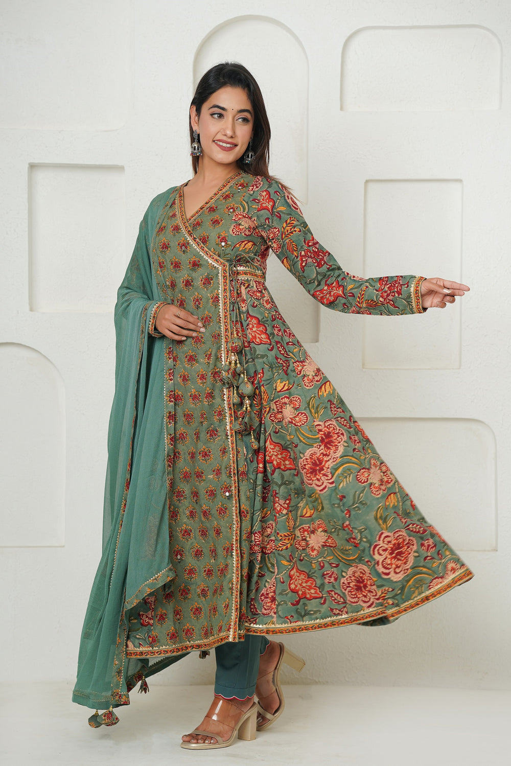 Introducing our enchanting Green Hand Block Printed Floral Angrakha, adorned with exquisite Gota Lace and delicate cutwork embroidery on pants. This ensemble embodies the timeless beauty of traditional craftsmanship with a modern twist. Paired with comfortable pants featuring matching details and complemented by a flowing semi-chiffon dupatta, it offers both elegance and comfort. Each floral motif, meticulously handcrafted, adds a touch of sophistication and charm. Perfect for special occasions or casual outings, this ensemble promises to elevate your style with its unique blend of heritage and contemporary fashion.