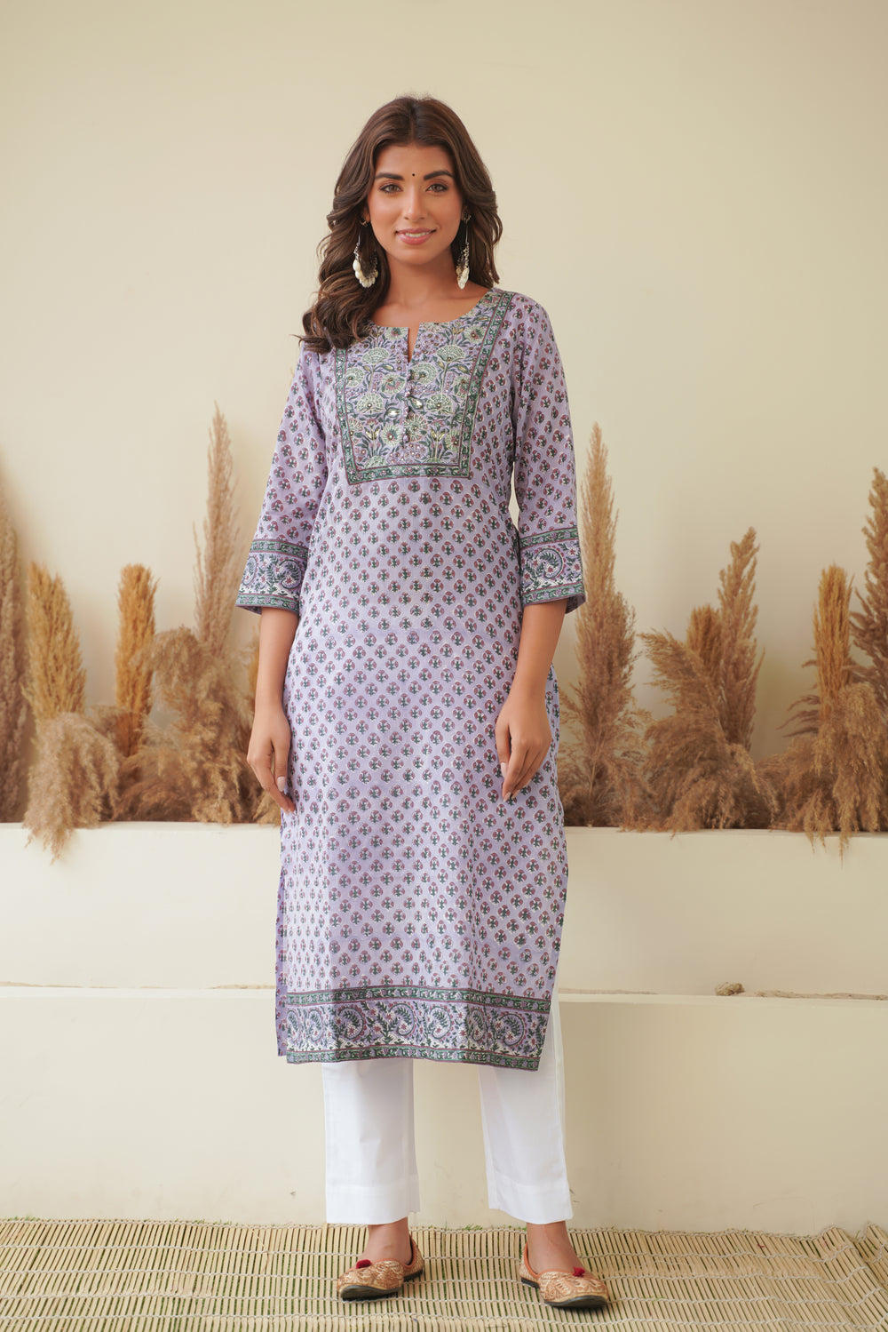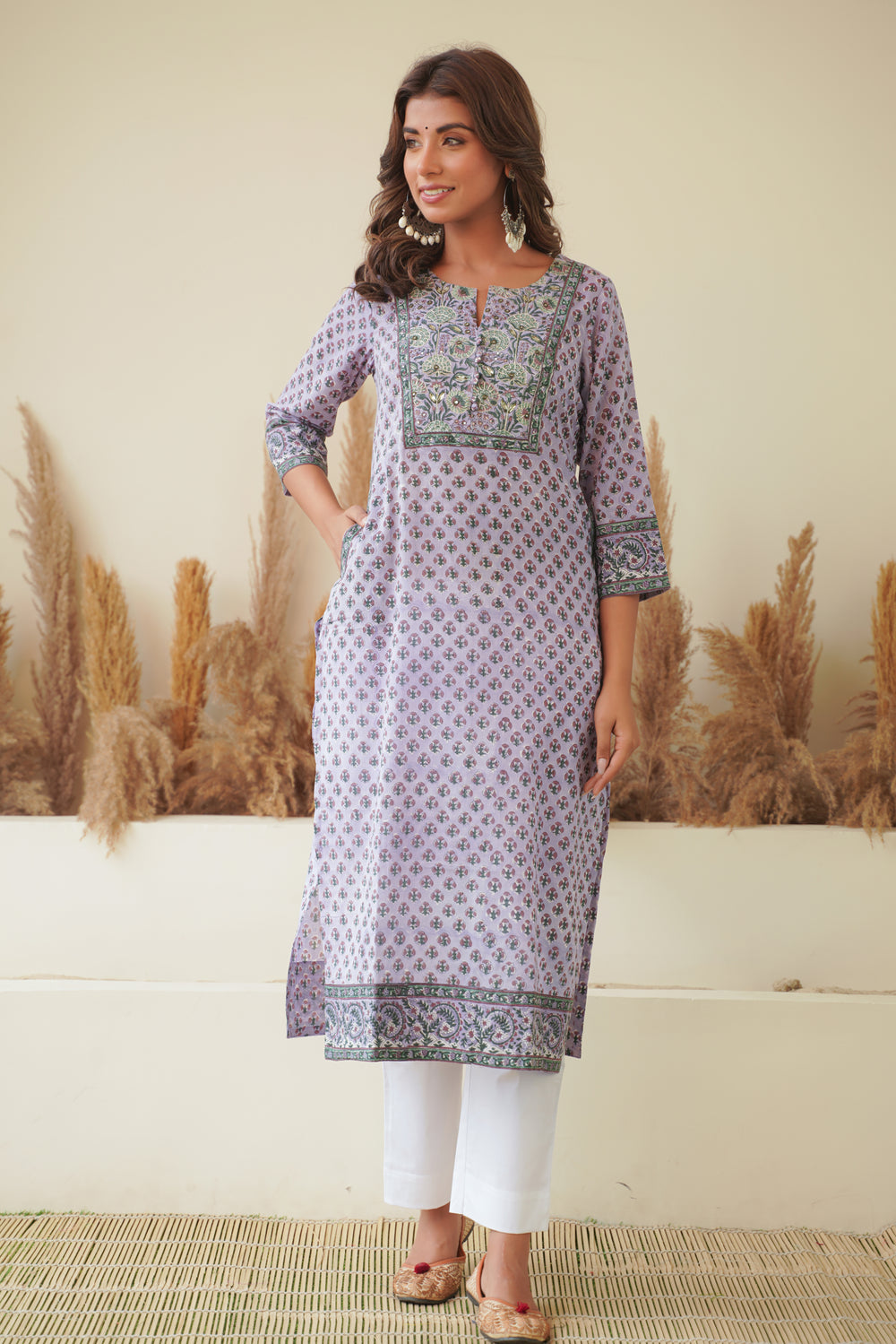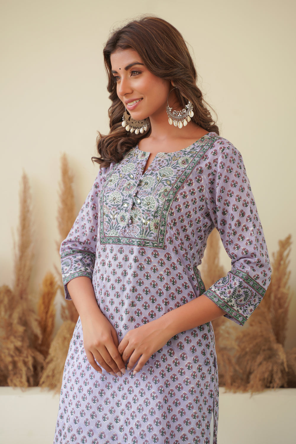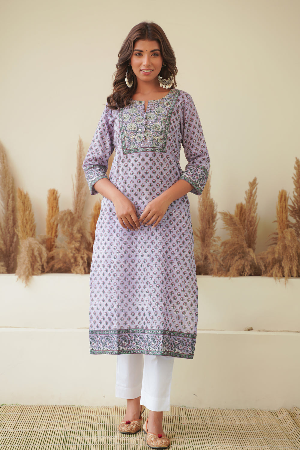Introducing our Lavender Floral Block Print Kurta, a masterpiece of elegance and tradition. Adorned with exquisite Gota Patti and Zari work along the neckline, this kurta radiates timeless beauty. The delicate floral motifs, meticulously handcrafted, add a touch of charm and sophistication. Perfect for both casual and formal occasions, this kurta promises to make a statement wherever you go. Embrace the rich heritage of Indian craftsmanship with this enchanting ensemble, designed to captivate hearts and turn heads.