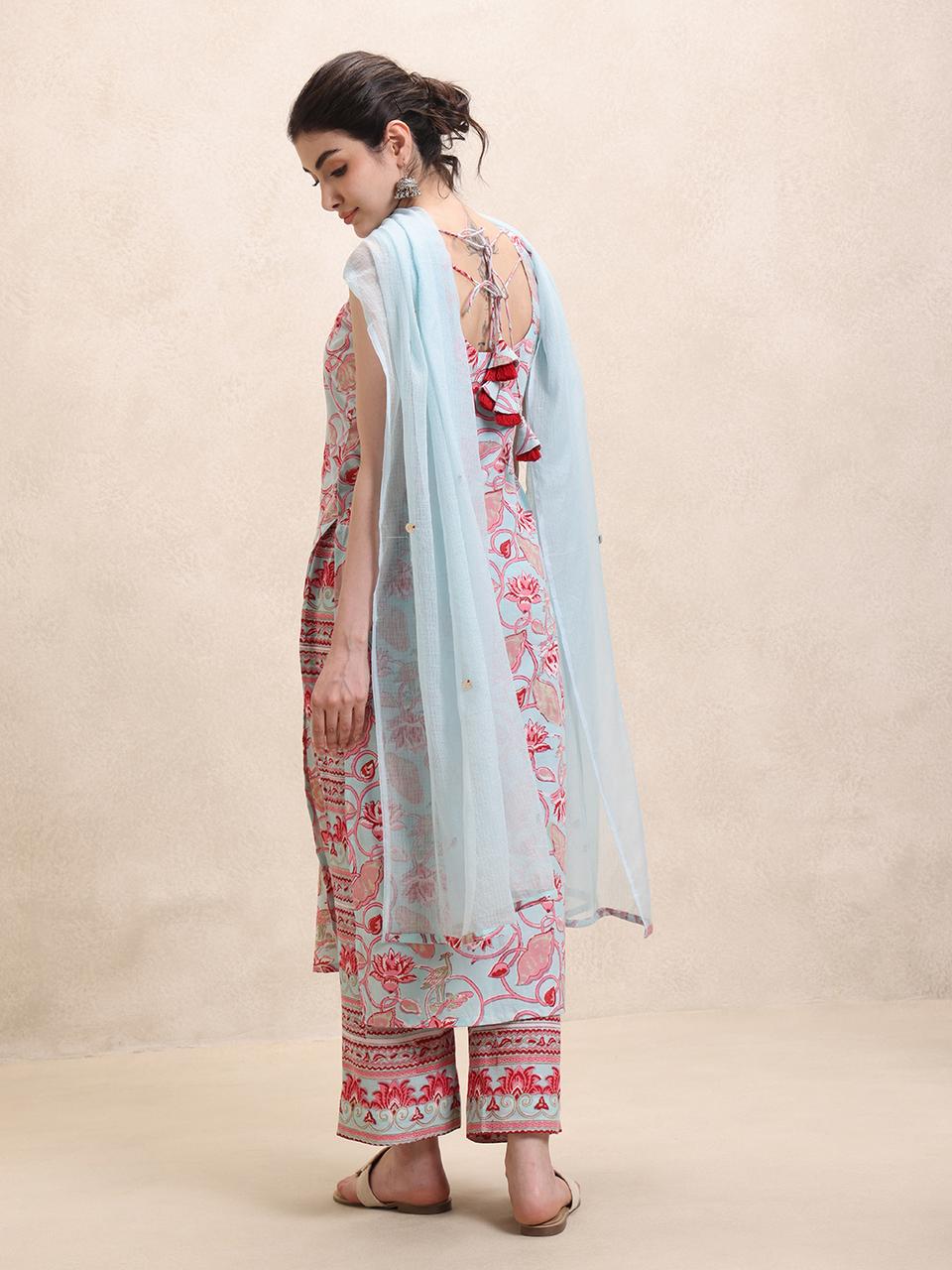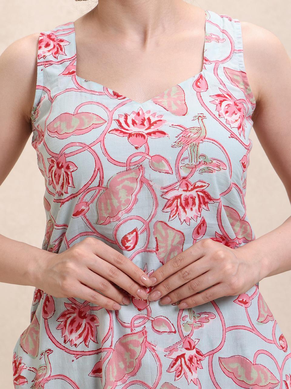 Fabric- 100% Cotton Colour- blue and pink Neckline-V-Neck Sleeves- Sleeveless