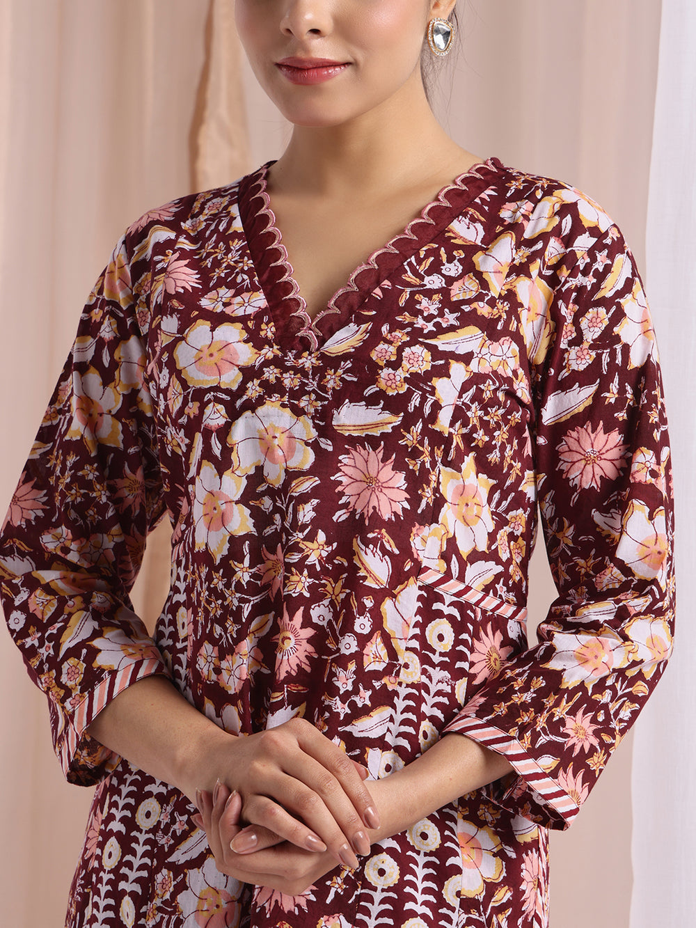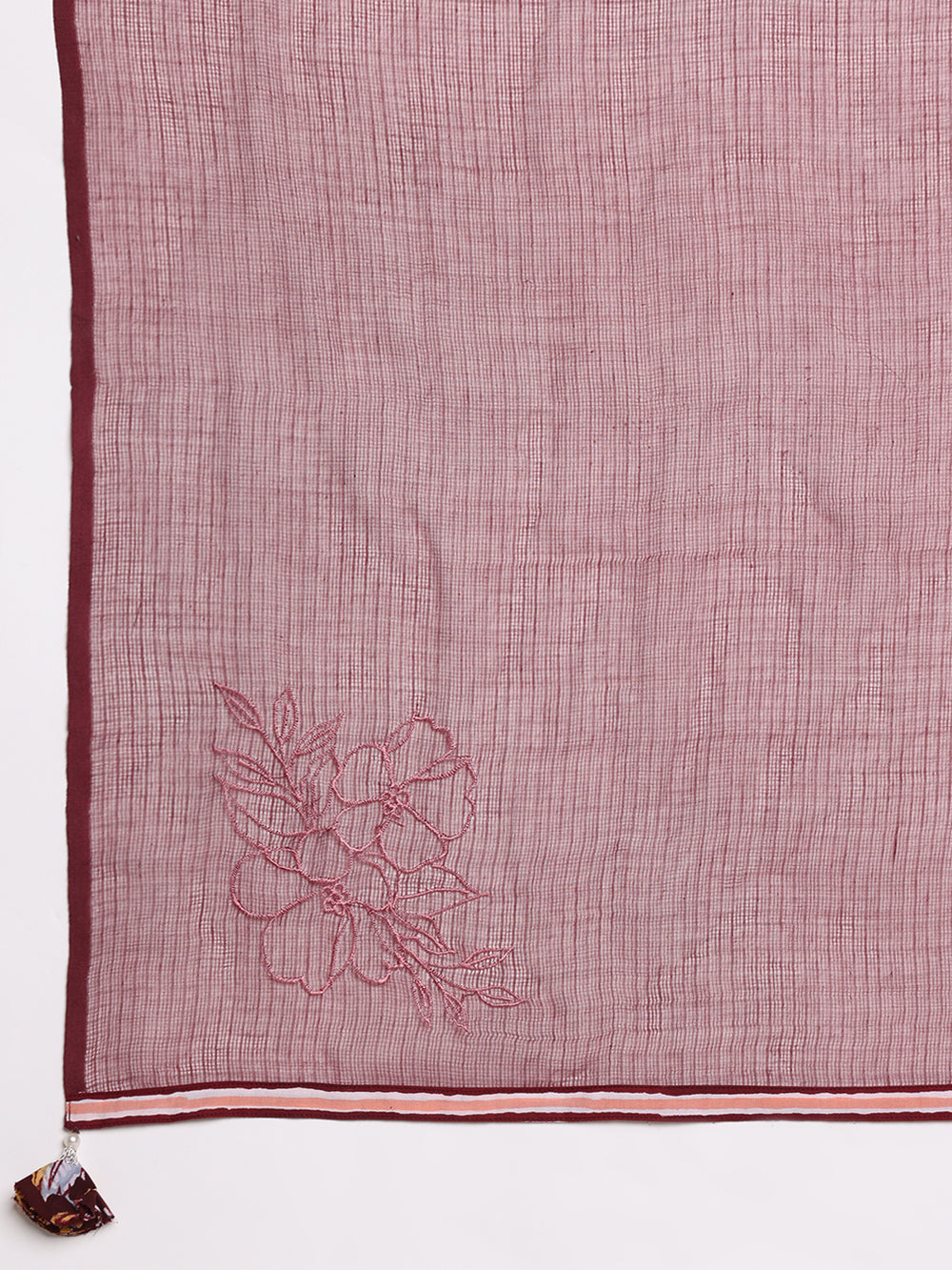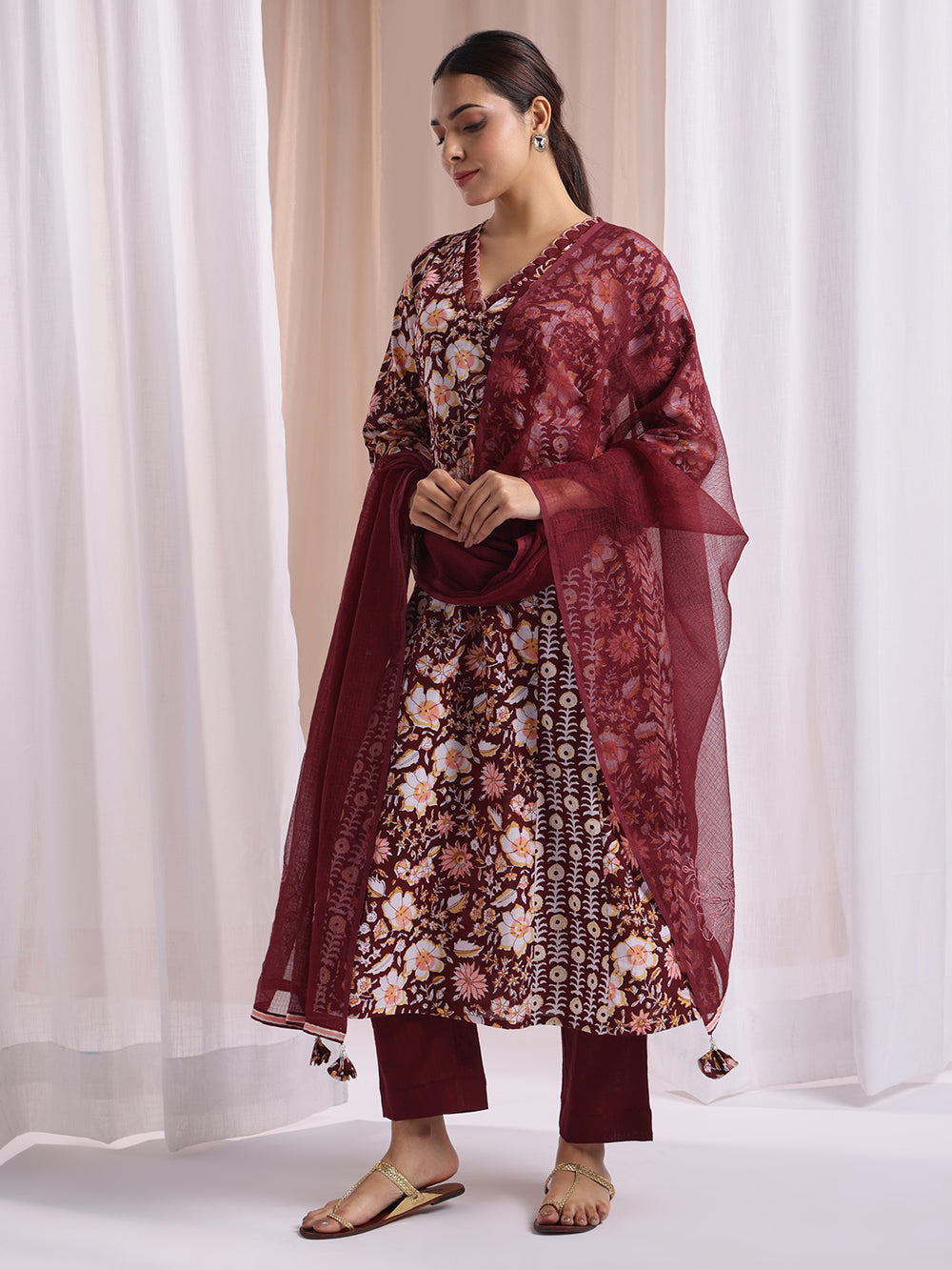 This maroon hand-block printed kurta features beautiful, detailed patterns, paired with plain pants for a sleek, balanced look. The outfit is complemented by a delicate doriya dupatta, adding elegance and flow to the ensemble. Ideal for both casual and semi-formal events, it blends traditional craftsmanship with modern comfort.