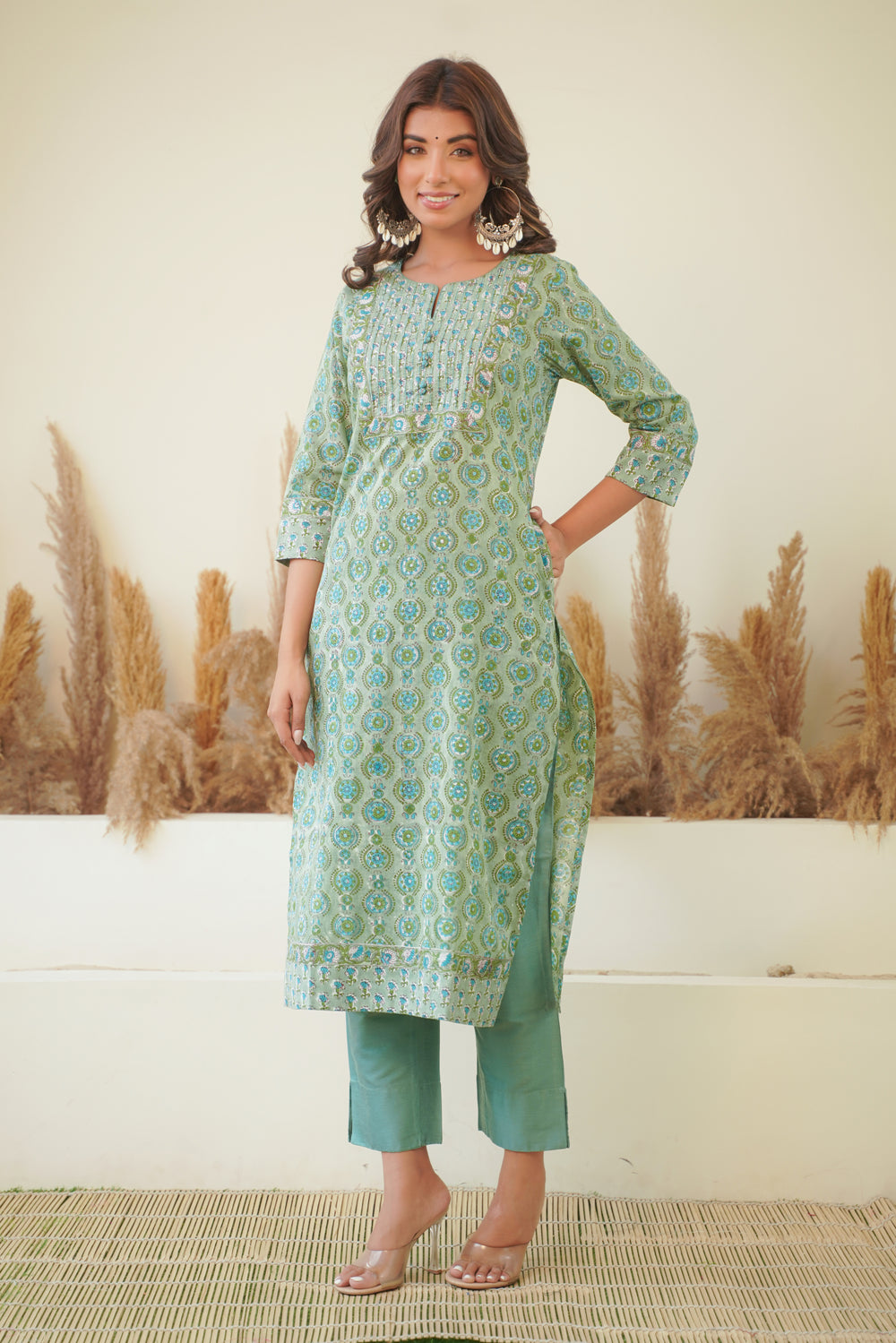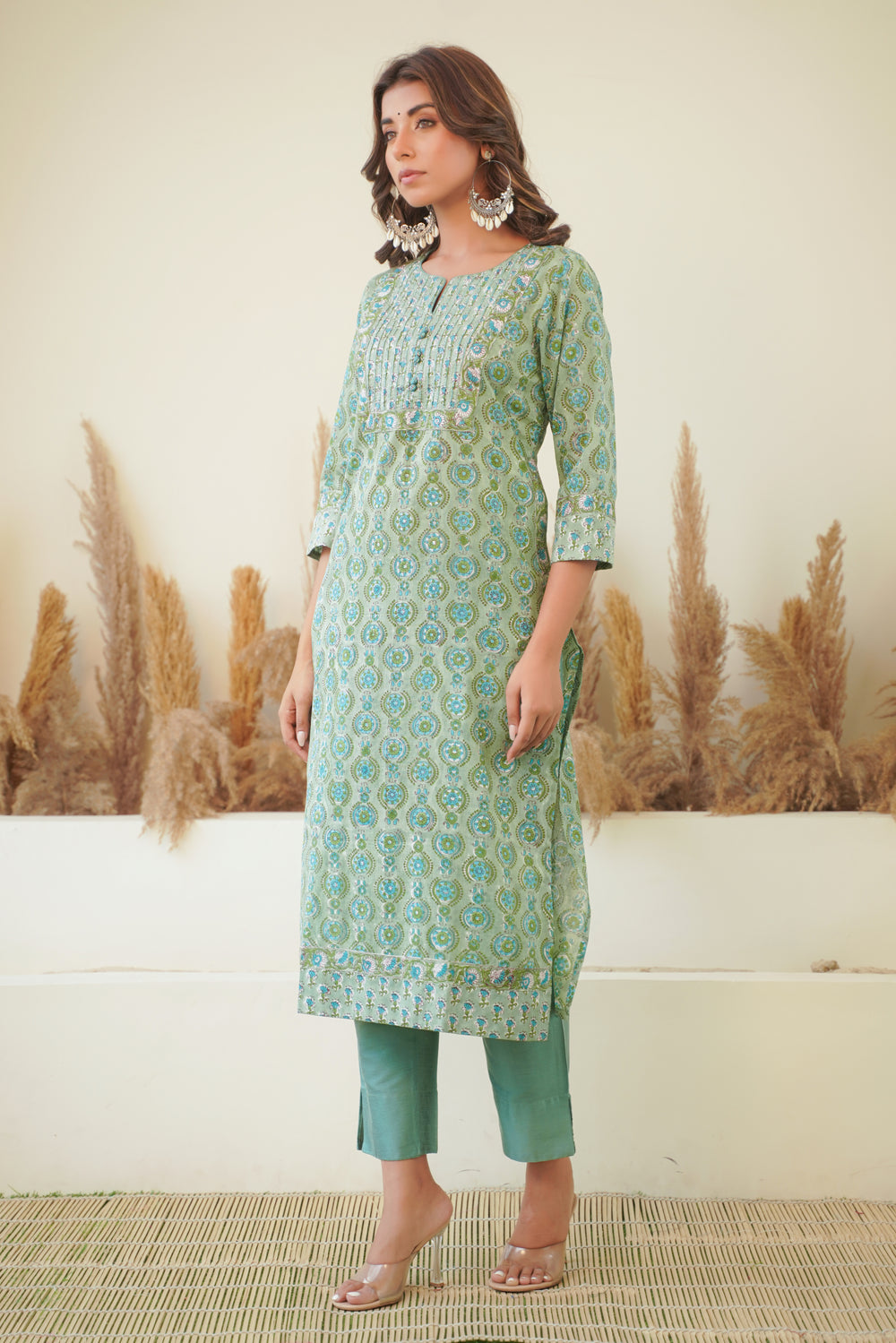 Introducing our enchanting Mint Green Floral Block Print Straight Line Kurta, adorned with delicate pintucks along the neckline. This exquisite piece captures the essence of spring with its vibrant floral motifs and refreshing hue. Crafted with care, it seamlessly blends traditional block printing techniques with modern design elements. Perfect for both casual outings and special occasions, this kurta promises comfort and style. Embrace the beauty of nature with every wear and make a statement wherever you go.
