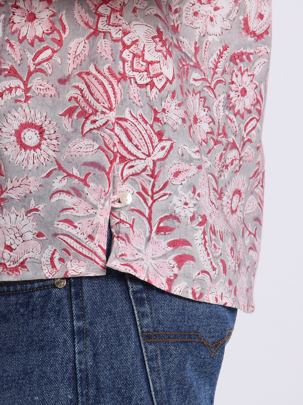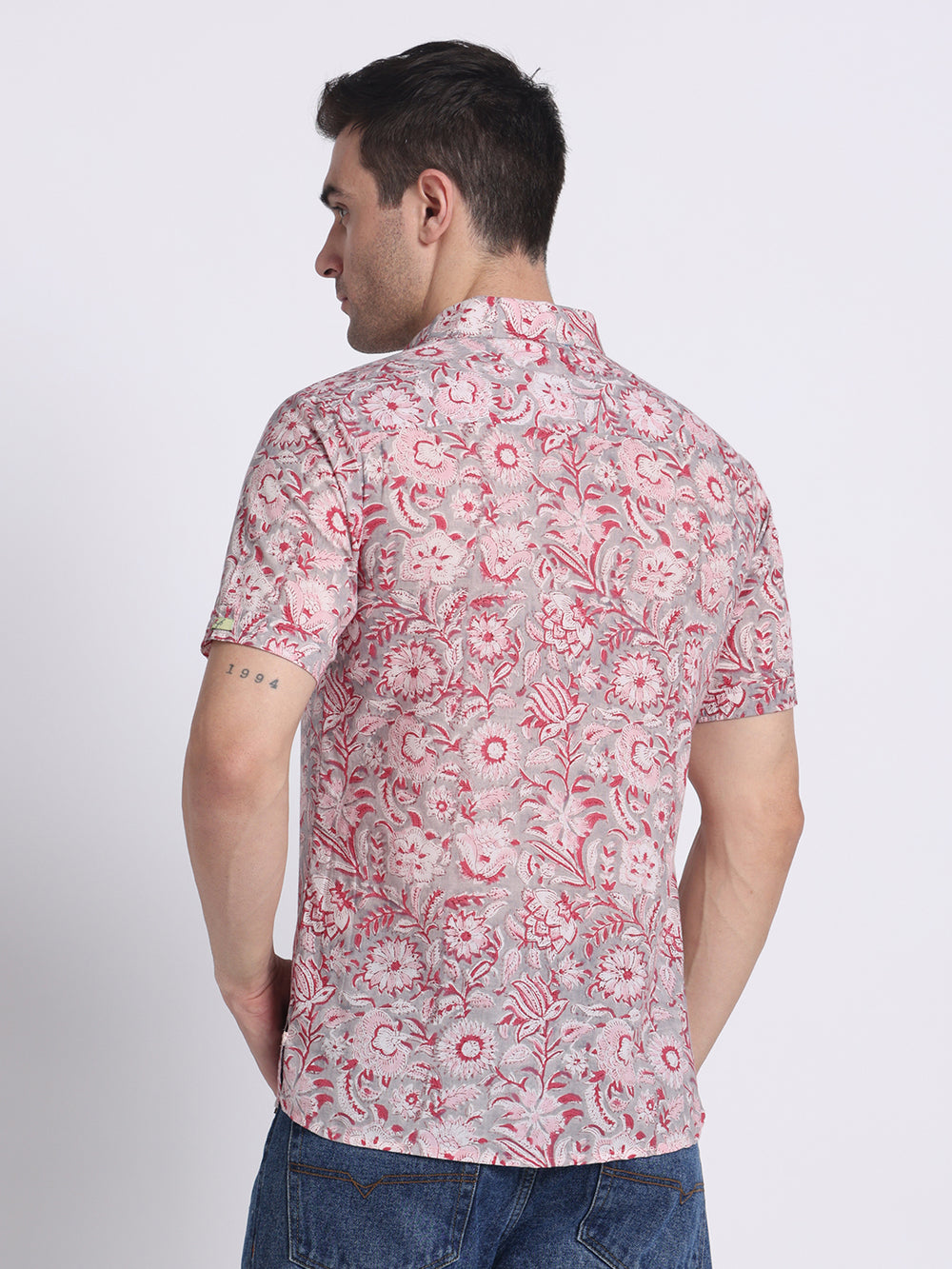 A vibrant pink block-printed men's shirt, showcasing intricate patterns that add a bold, stylish touch to the design. Crafted from soft, breathable fabric, it ensures comfort with a relaxed fit. Perfect for casual or semi-formal occasions, this shirt pairs effortlessly with jeans or chinos for a modern, eye-catching look.
