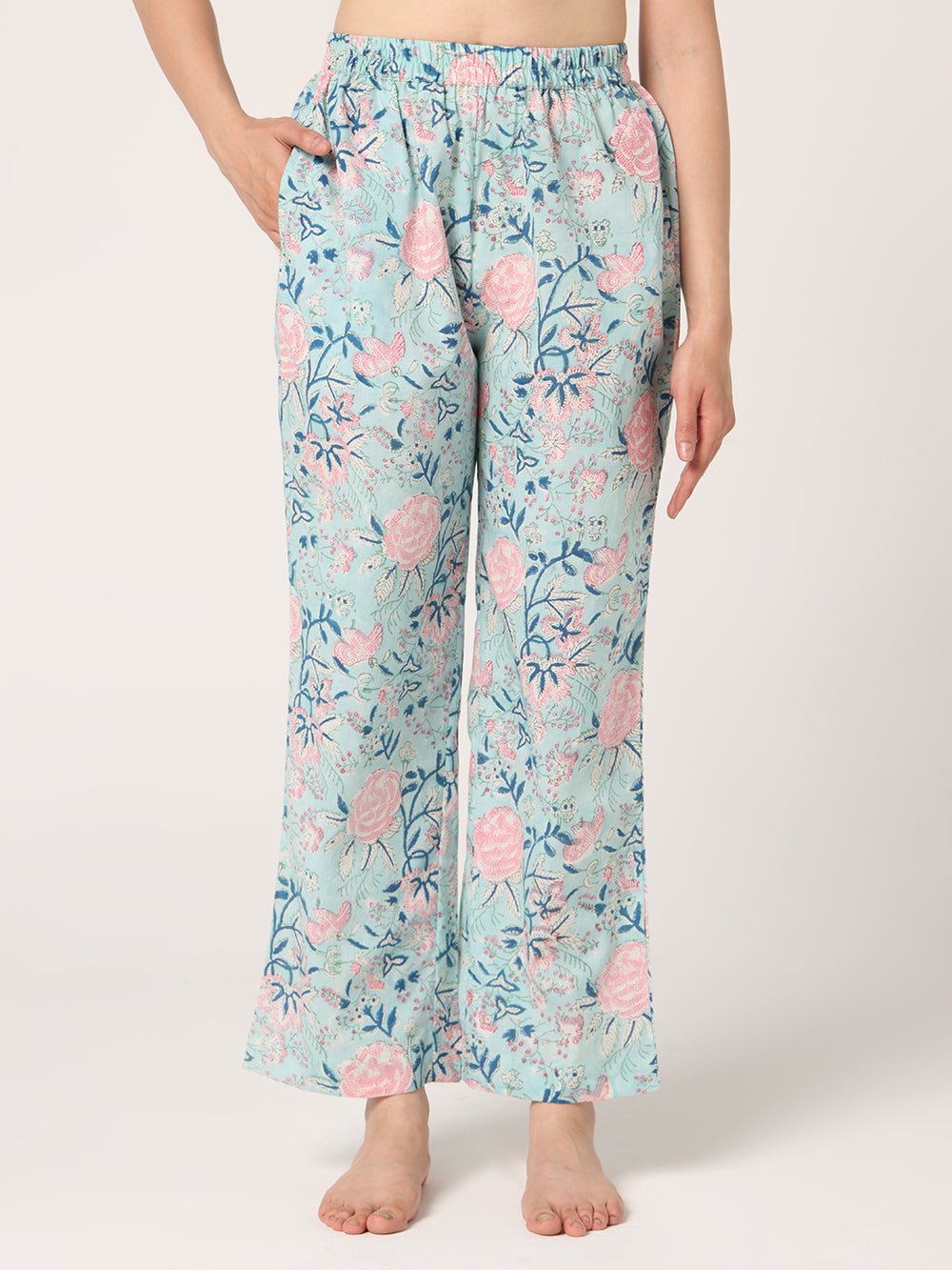 Drift into dreamland with Jaipuri Banno's enchanting Pink-Blue sleeveless hand block printed full night suit. Made with comfortable fabric, this night suit is ideal for lounging around or sleeping. Addittional information=