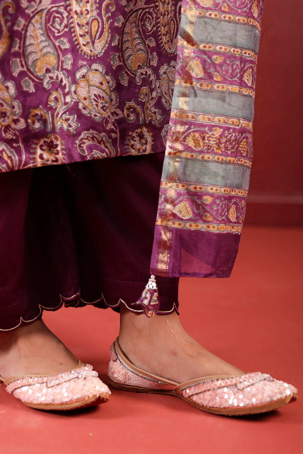 A Purple Chanderi Block Print Suit sounds elegant and is a beautiful fusion of traditional Indian textile artistry with timeless design. Chanderi fabric is known for its lightweight, sheer texture, and luxurious feel, often combined with silk or cotton threads.