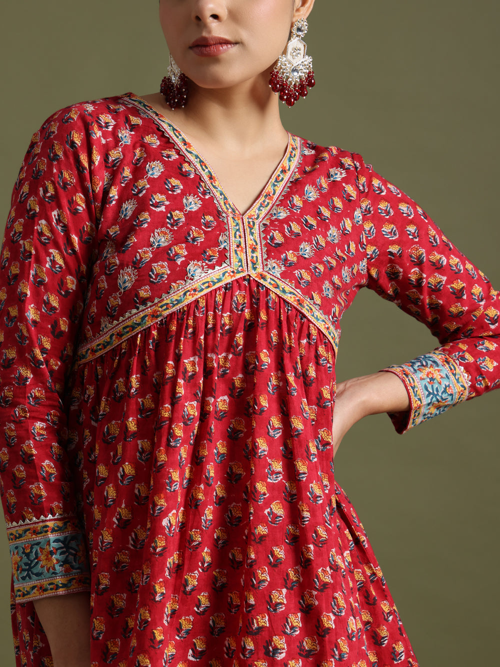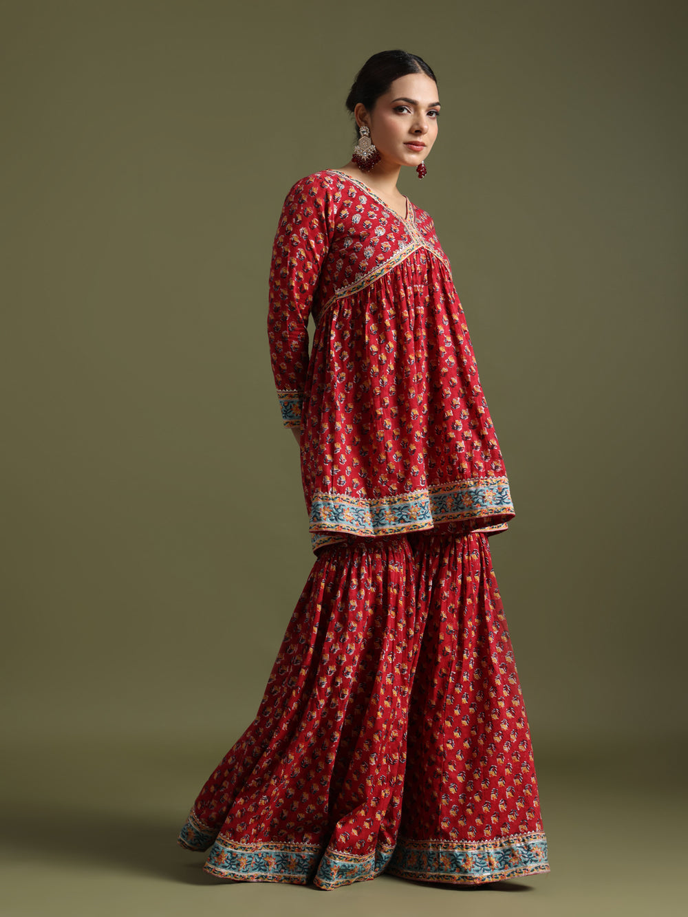 The Red Block Print Sharara Set features a striking red kurta with detailed block print designs, paired with a stylish, flared sharara bottom. Made from soft, breathable fabric, it offers a comfortable fit with three-quarter sleeves. Ideal for festive or casual events, this set blends traditional block print artistry with modern elegance.
