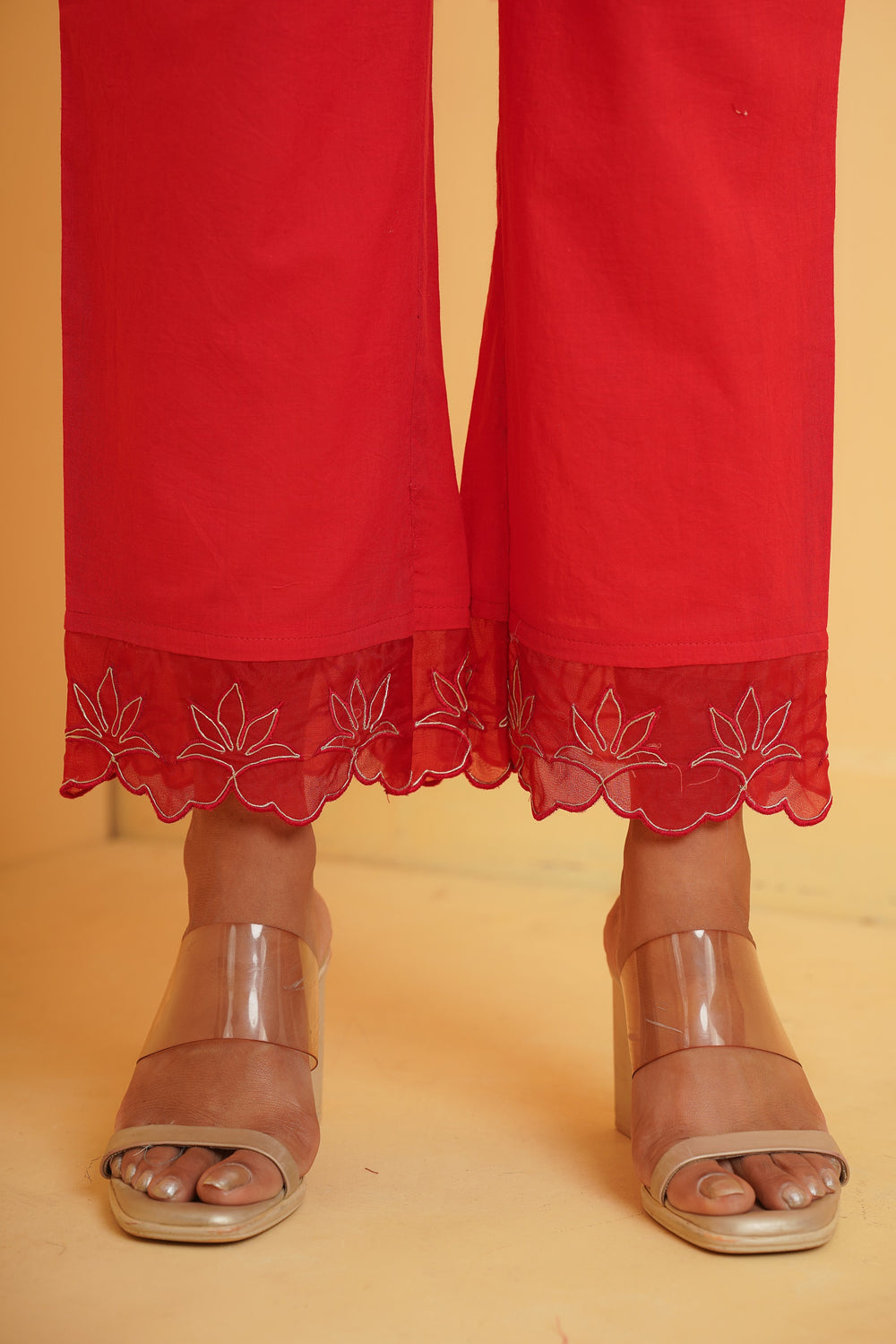 Introducing our stunning Red Floral Handblock Print Flared Kurta, a harmonious blend of traditional artistry and modern flair. Adorned with intricate cutwork embroidery on a Kota Doriya Dupatta, this ensemble exudes elegance and sophistication. Paired with comfortable cotton pants, it offers both style and ease. Each floral motif, meticulously handcrafted, tells a story of heritage and craftsmanship. Perfect for festive occasions or casual gatherings, this ensemble promises to turn heads and leave a lasting impression. Embrace the timeless beauty of handblock printing with this exquisite piece.