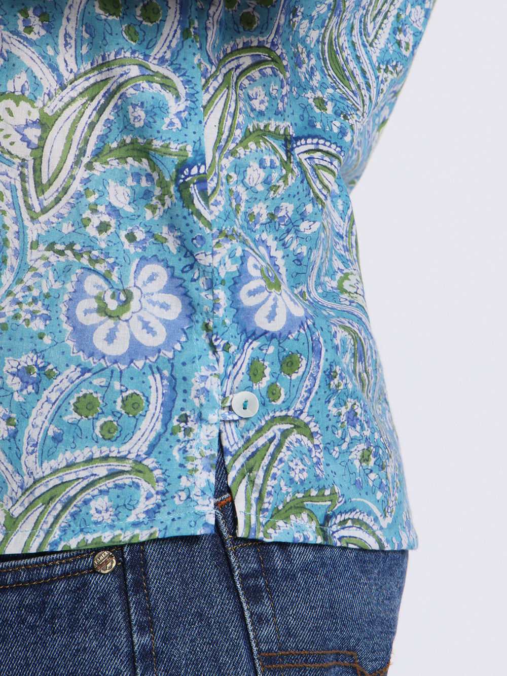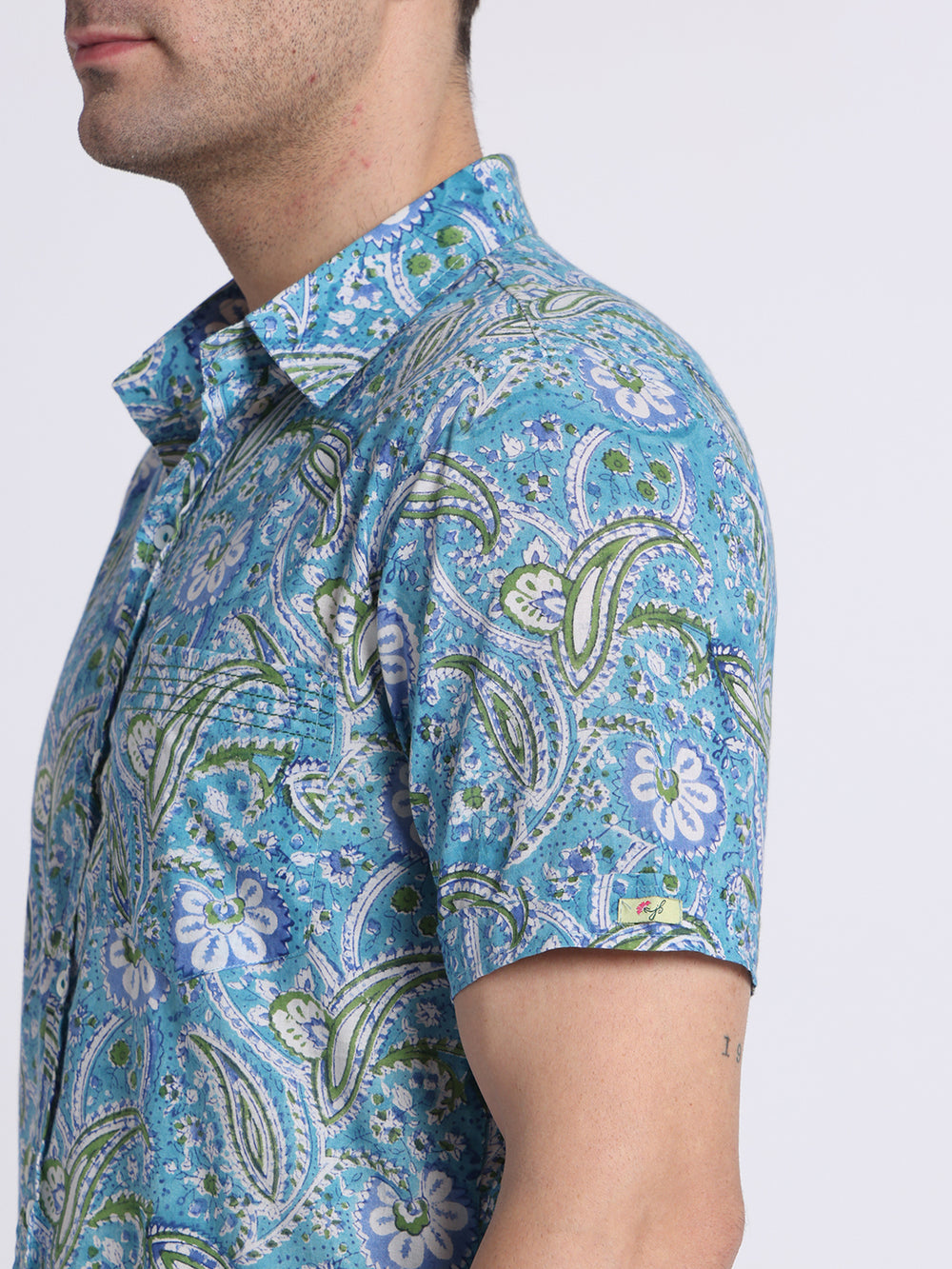 A fresh sky blue block-printed men's shirt, featuring elegant patterns that add a touch of style to the soft, light blue fabric. Made from breathable material, this shirt offers a comfortable, relaxed fit. Ideal for casual or semi-formal occasions, it pairs effortlessly with jeans or chinos for a laid-back, yet fashionable look.