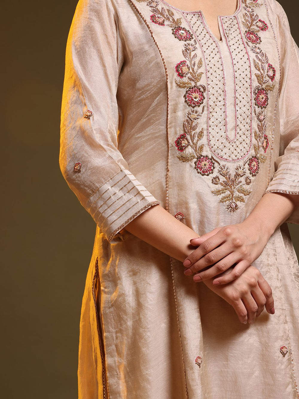 Elevate your festive wardrobe with Chand, a graceful 4-piece Chanderi suit set in a serene white and goldenish hue. Adorned with delicate handwork on the neckline, this ensemble exudes subtle elegance and timeless charm — perfect for celebrations that call for understated glamour.