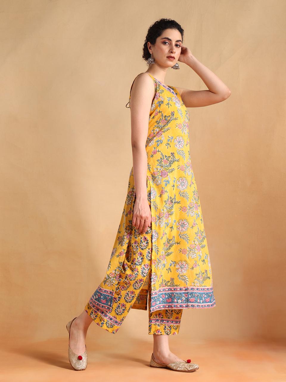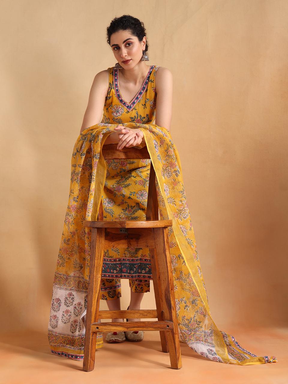 Shine bright with Jaipuri Banno vibrant yellow Kota doriya sleeveless suit, featuring a classic V-neck design. This stunning ensemble combines traditional elegance with modern charm, perfect for any occasion. The intricate Kota doriya fabric adds a touch of sophistication, making it a beautiful addition to your wardrobe.